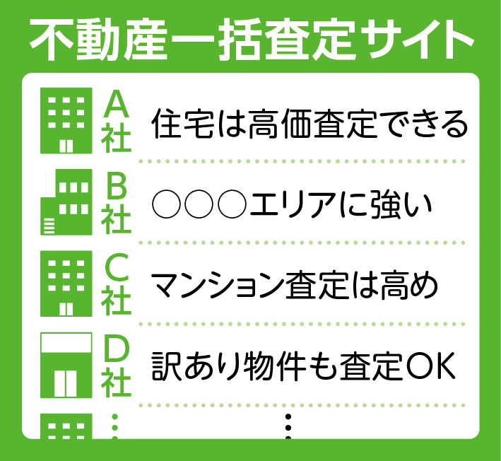 下記は査定サイトの中でも実績豊富・登録社数多数・特殊不動産にも対応の人気の厳選サイトです。